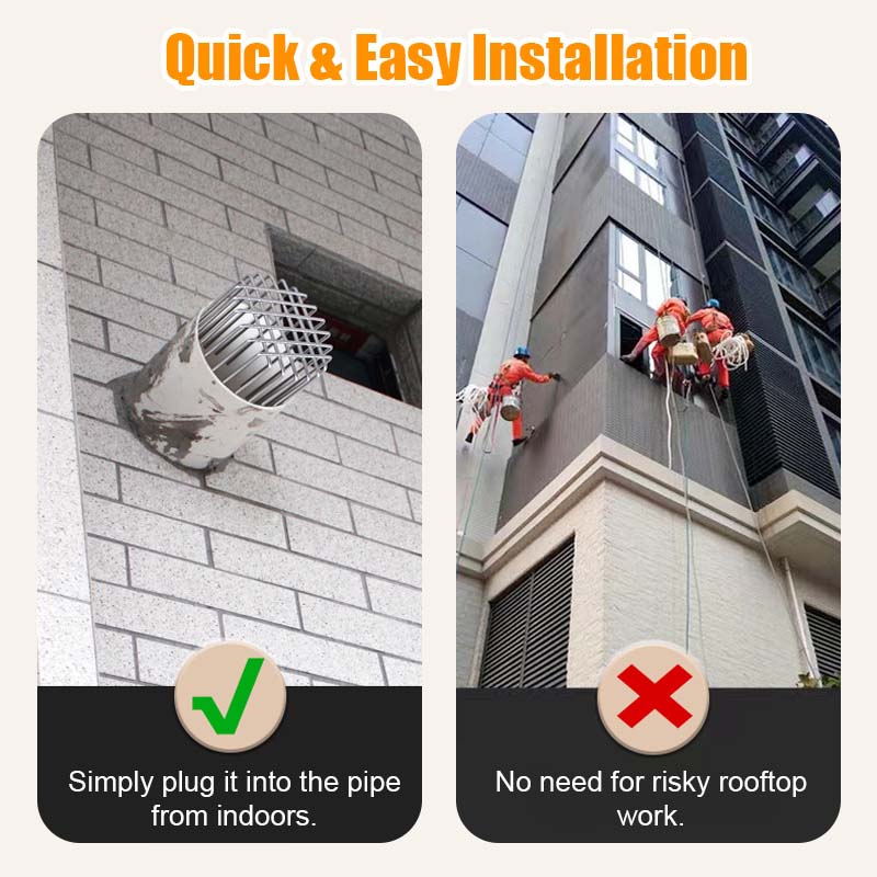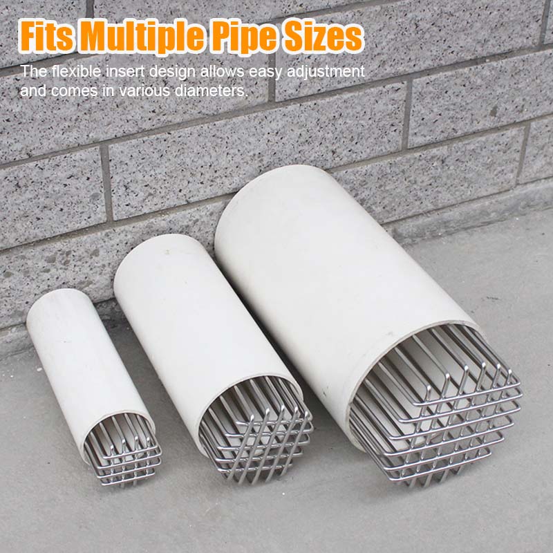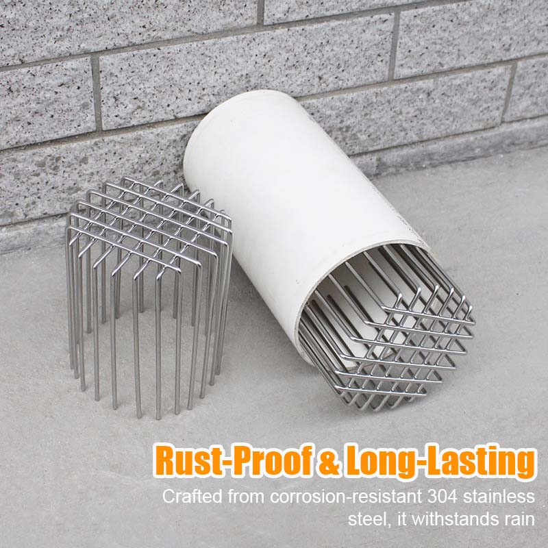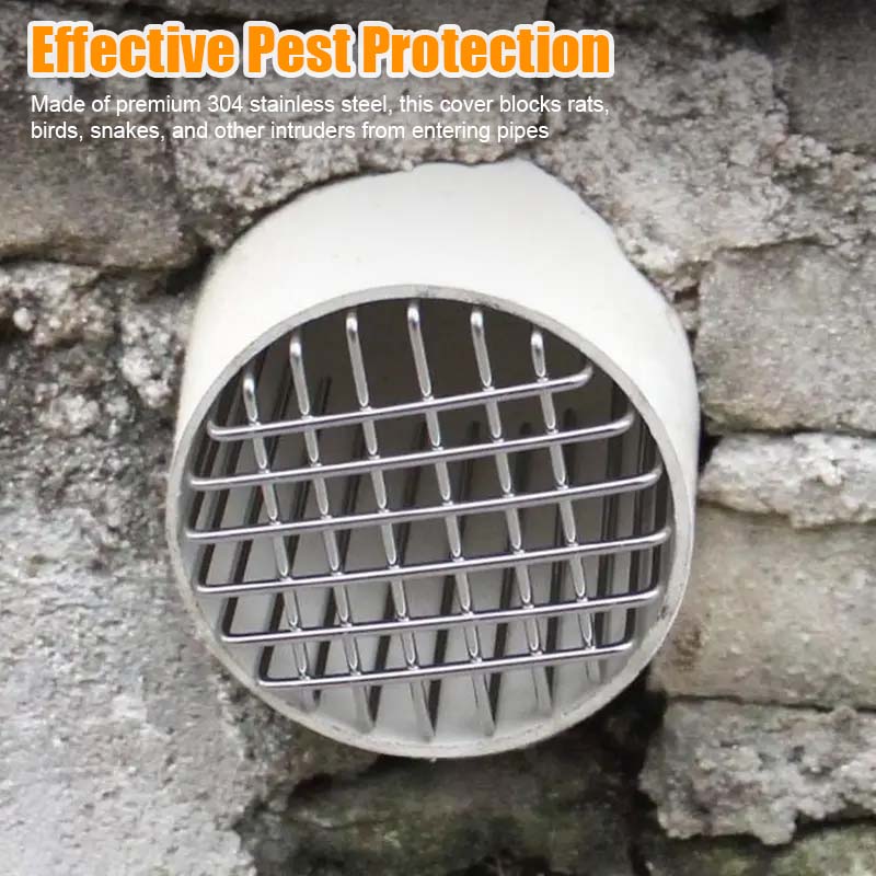Laget av førsteklasses 304 rustfritt ståll, Dette dekselet hindrer rotter, fugler, slanger og andre inntrengere i å komme inn i rørene - og forhindrer reir, tilstopping og skader.