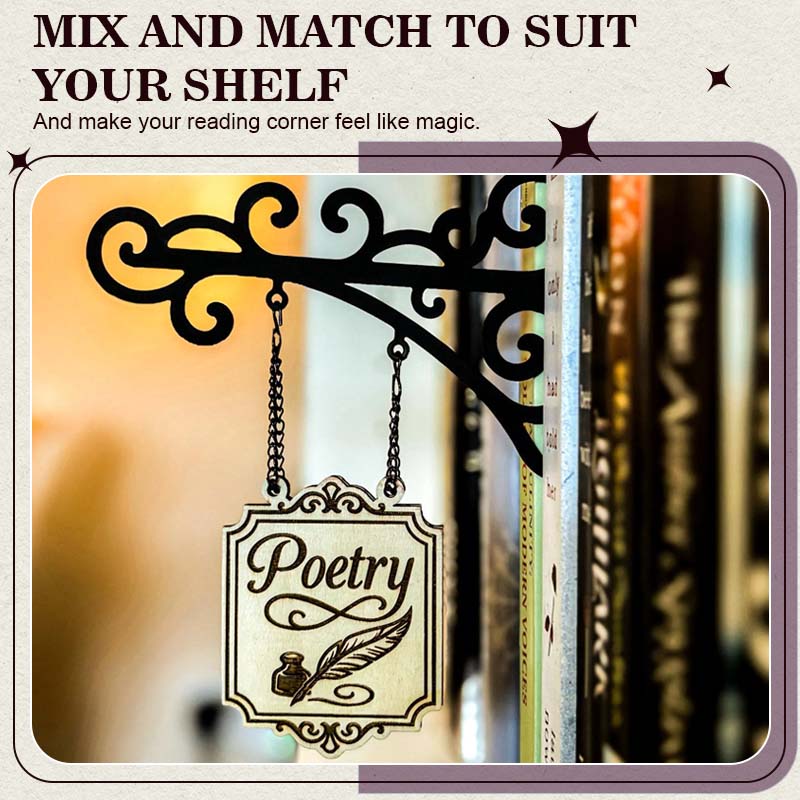 Ta steget inn i en verden der hver sjanger har sin egen koselige krok 🍷✨. Inspirert av klassiske kro- og butikkskilt, disse finurlige boksjangerinndelerne bringer et snev av mystikk, eleganse og fortellingsmagi rett inn i hjemmebiblioteket ditt. De er mer enn bare organisatorer, de gjør bokhyllen din til et sted du vil elske å utforske - akkurat som en liten favorittbokhandel.