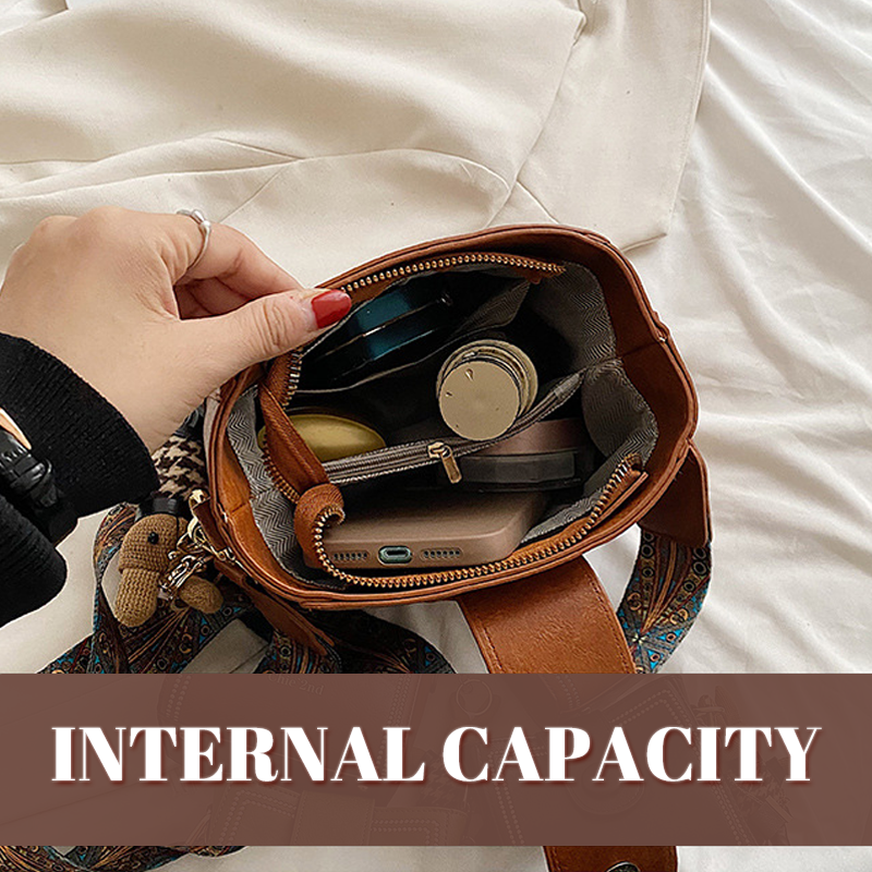 📱 Romslig innredning: Vår bøtteveske har en romslig innredning med flere lommer, noe som gir god plass til å holde det viktigste organisert og innen rekkevidde.
