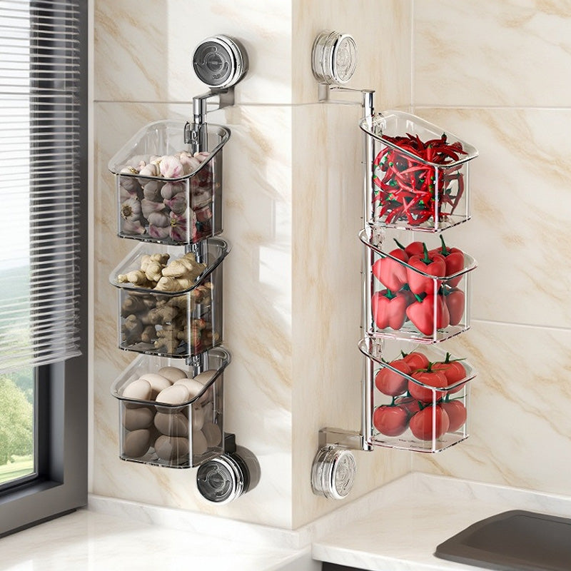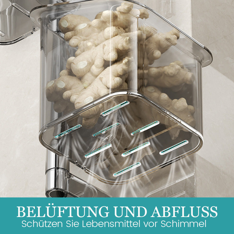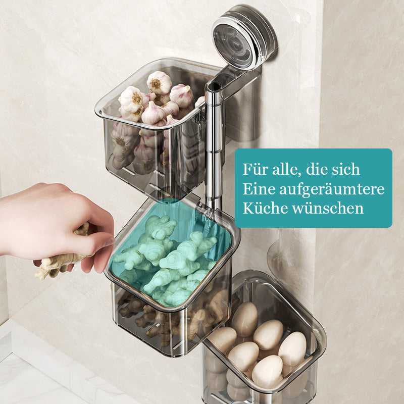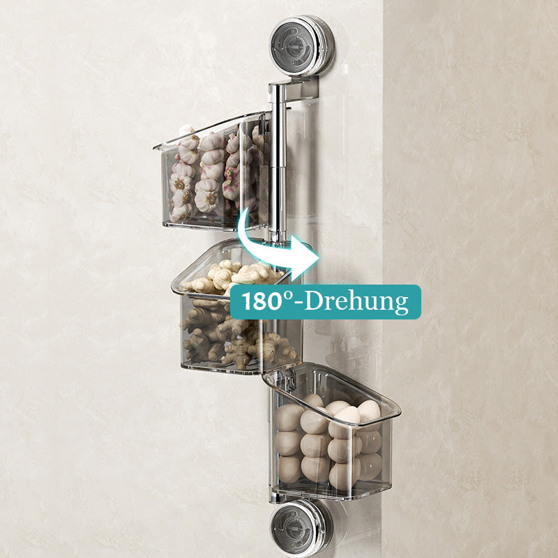 Denne veggmonterte oppbevaringsboksen med sugekopp er stansefri og kan dreies 180°. Den egner seg til oppbevaring av krydder, løk, ingefær og hvitløk, og er også ideell til oppbevaring av kosmetikk og toalettartikler på badet. Den hule dreneringsstrukturen i bunnen holder boksen tørr og forhindrer at det dannes matrester og mugg.