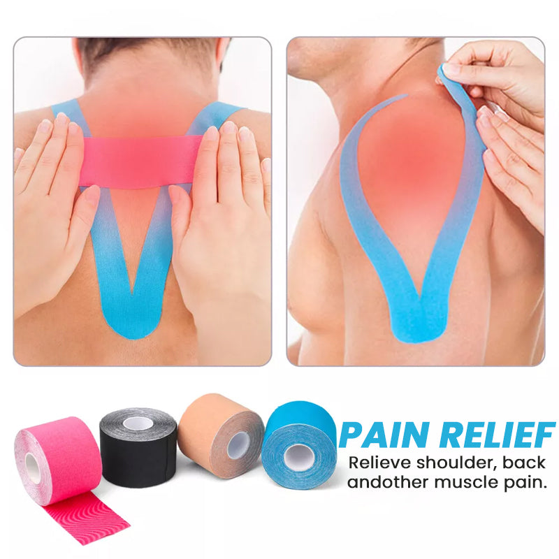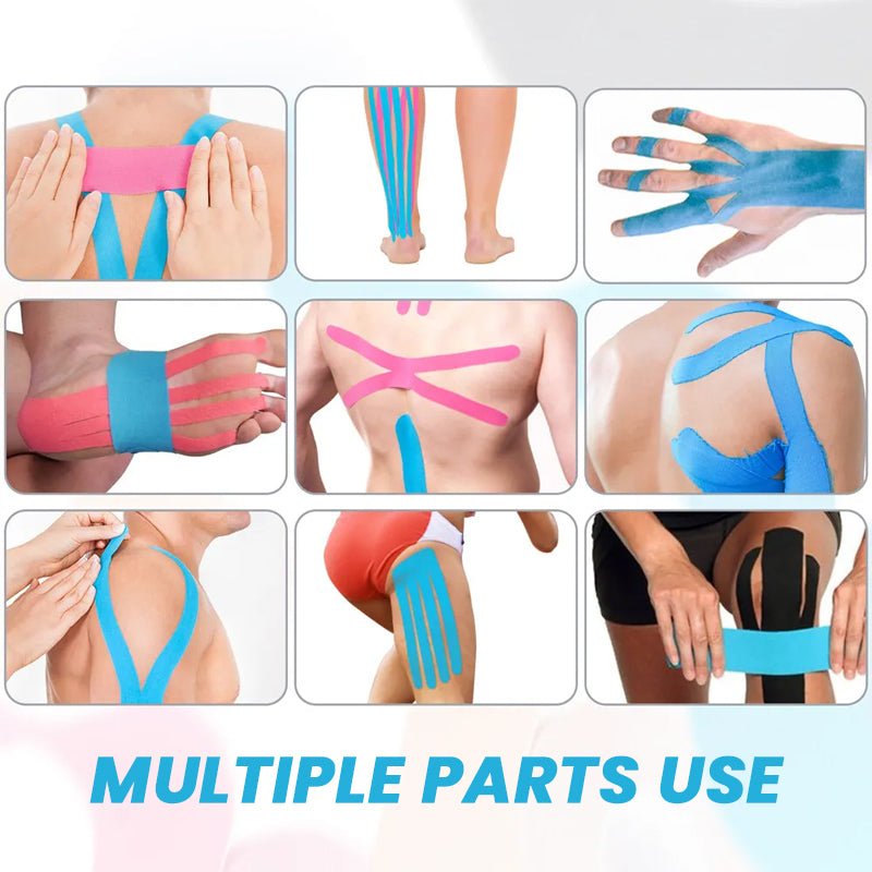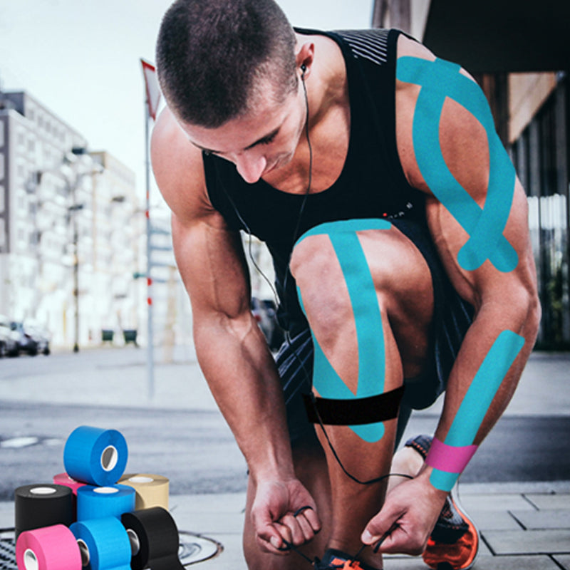 Kinesiologitape kalles også muskeltape eller fysiotape. Det er en elastisk bomull som virker på musklene. Den er klebrig og fester seg til huden, øker det subkutane vevsrommet og fremmer blod- og lymfesirkulasjonen. For å lindre muskelspenninger og muskelsmerter. Samtidig kan den støtte og stabilisere muskler og ledd uten å hindre bevegelse. Flott for fysioterapi i forbindelse med trening.